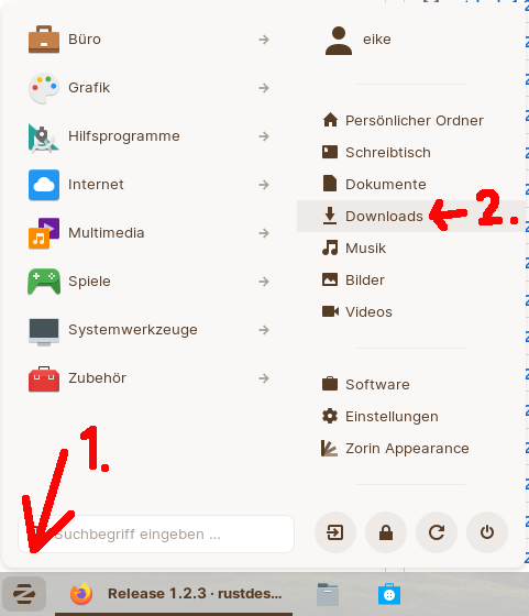 Klicken Sie unten Links auf das “Z”(1.) und dann auf Downloads (2.) -