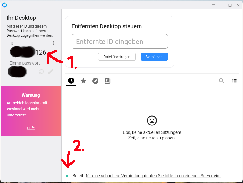 Warten Sie erst ab bis unten die Verbindung “bereit” ist (siehe im folgenden Bild Punkt 2.). Im Bild sehen Sie unter “1.” die ID die ich benötige um mich zu Ihnen zu verbinden. Da drunter wird das Passwort angezeigt.